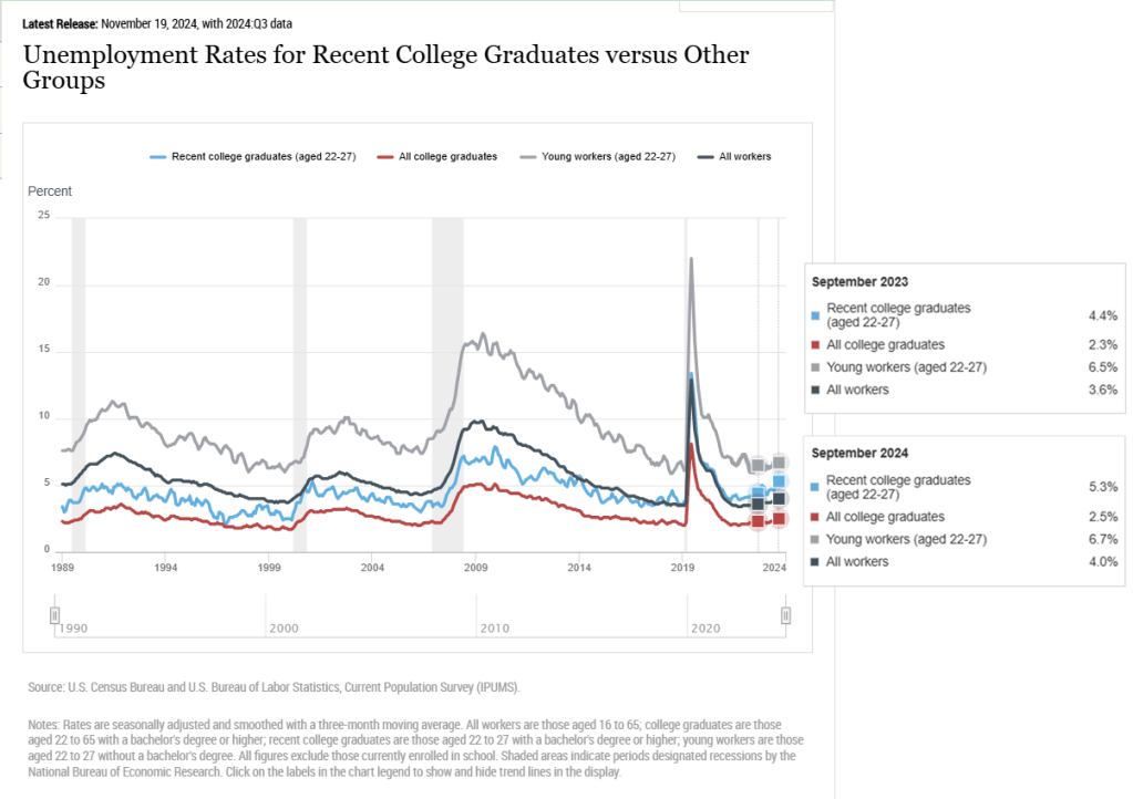 While the statistics in this article are from September 2023, they still hold true. If we look at Figure 1 below, the unemployment rate for recent graduates has risen to 5.3 percent as of September 2024 and is more than double for all workers with a college degree at 2.5 percent (“The Labor Market for Recent College Graduates”).
